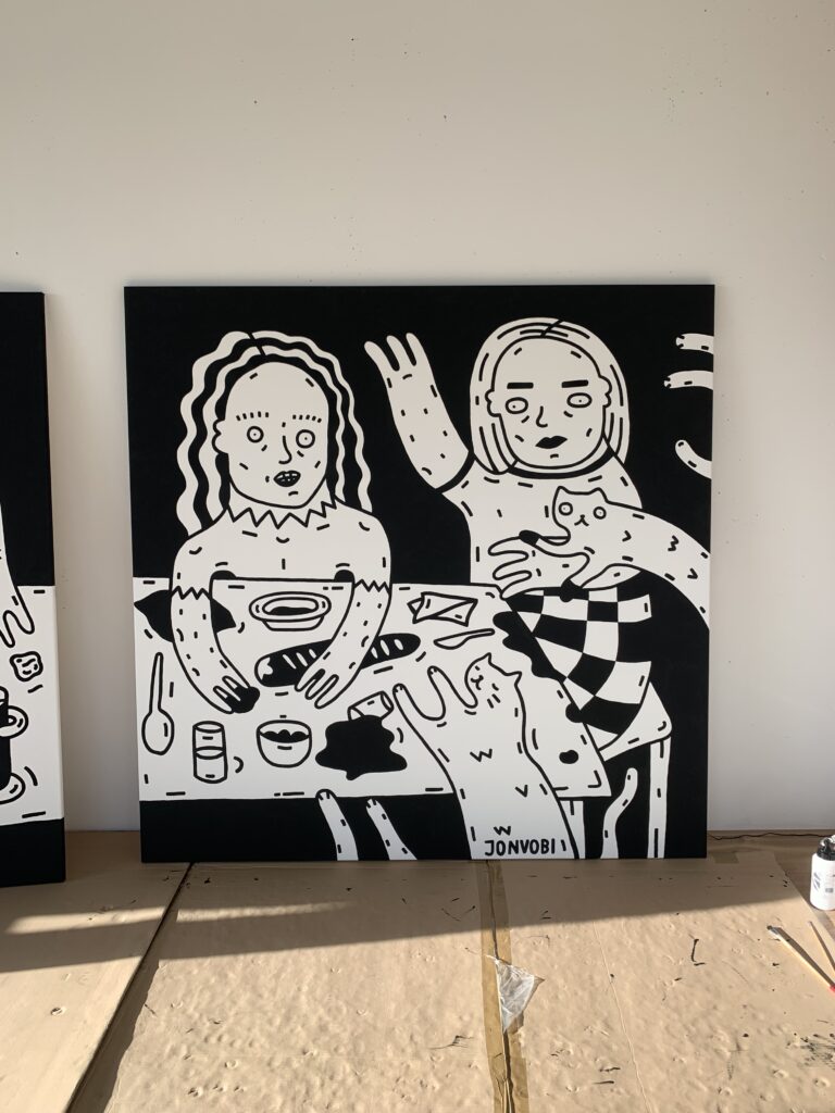 all three paintings are 1.80 x 1.80 m and hand painted with acrylics on canvas. all works are for sale, please get in touch by e-mailing jonvobi@icloud.com.