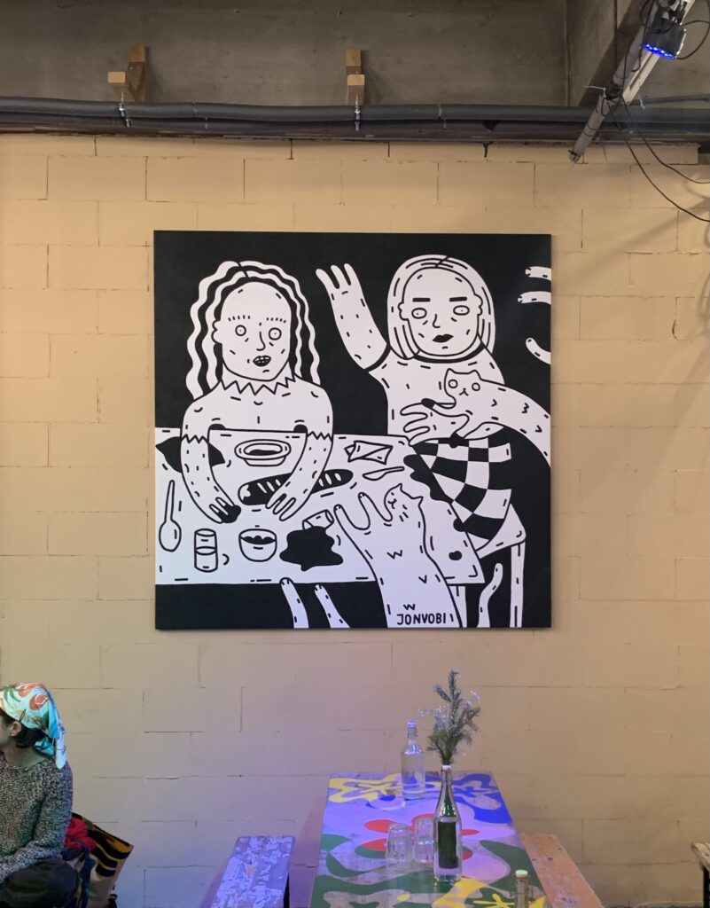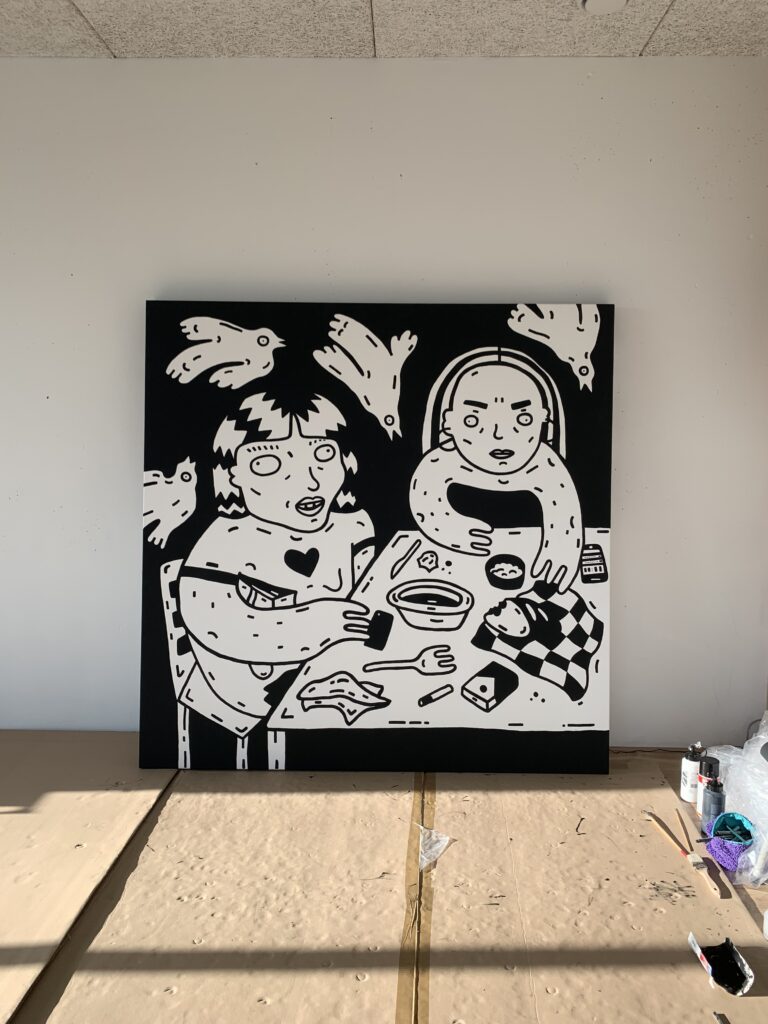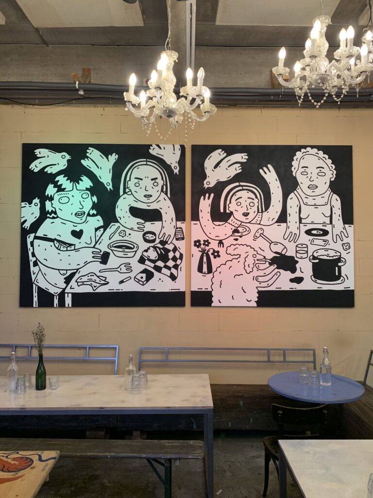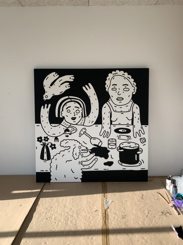 ‘at the table,’ a solo exhibition consisting of three paintings, is currently on display at de sering in amsterdam.